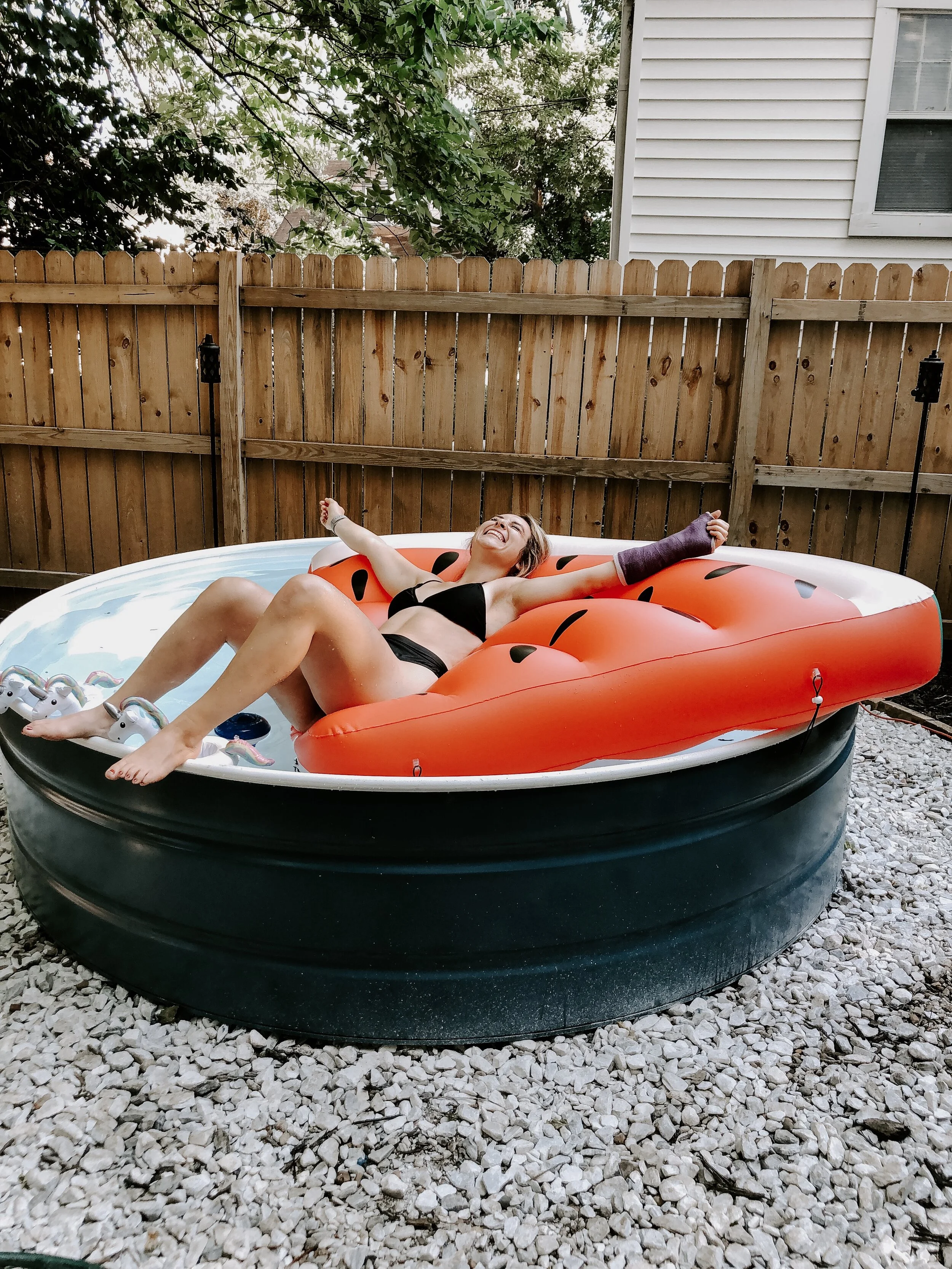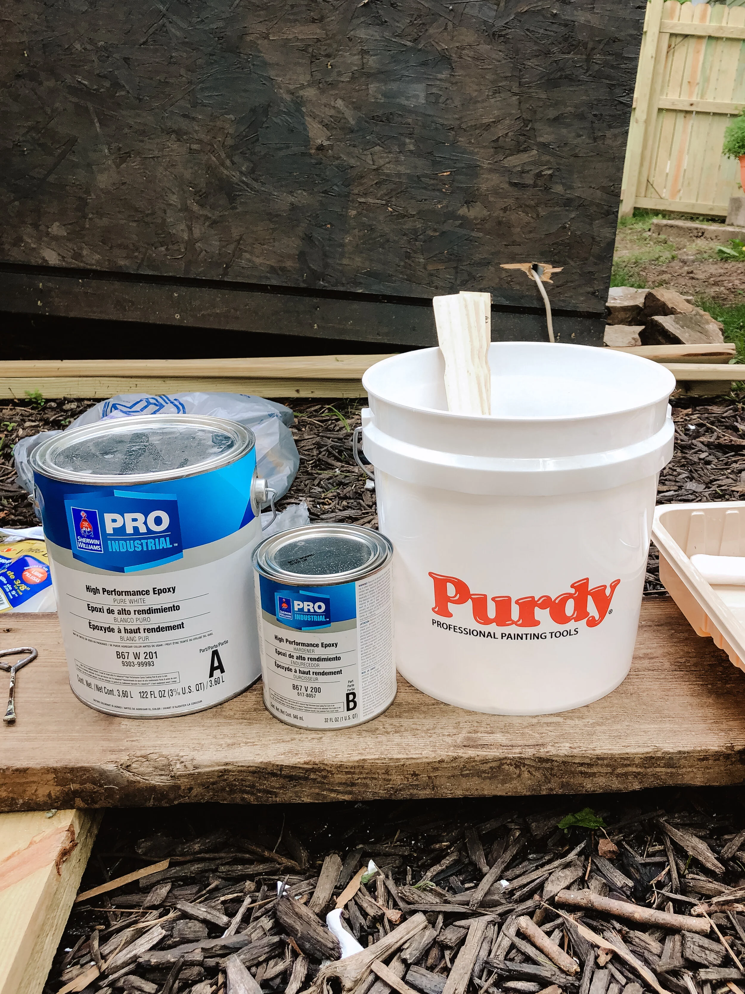I put a picture up on Instagram about having to sand the flex seal and I had some people send me messages that I should use High Performance Epoxy from Sherwin Williams. Determined to never sand a stock tank pool again, we did a ton of research. This epoxy is used on the outside of oil rigs and is basically as tough and resilient as you can get. It is a bit more pricey but was so worth it.
